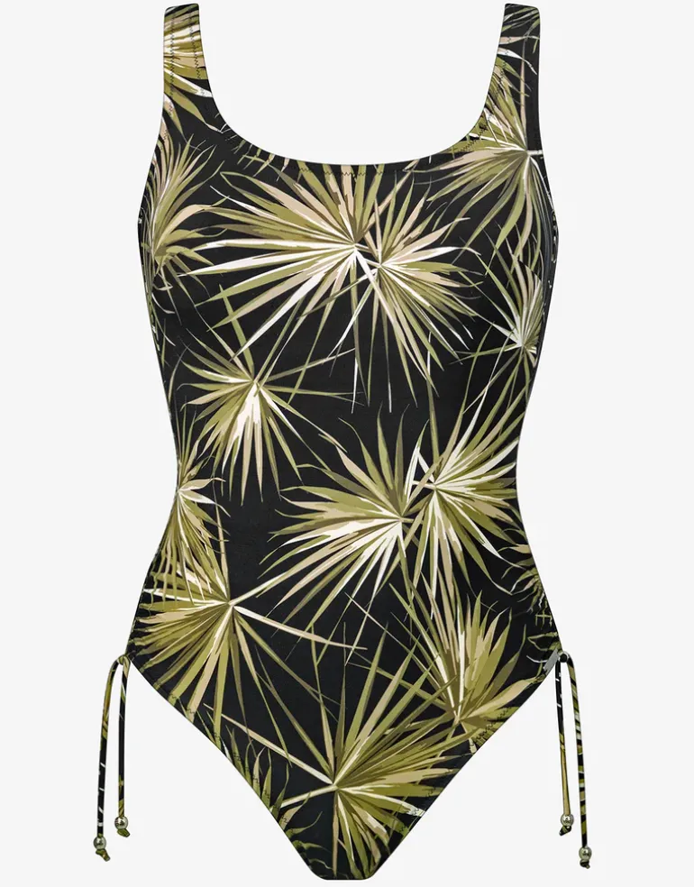 The Yucca Flash Inclusive Fit swimsuit from Charmline in this stunning print of yucca palm leaves against a black background appears like fireworks in the night sky. Featuring light shaping and soft padded cups, it offers both comfort and support. Additionally, internal pockets are provided, making it suitable for women who have had mastectomy surgery.