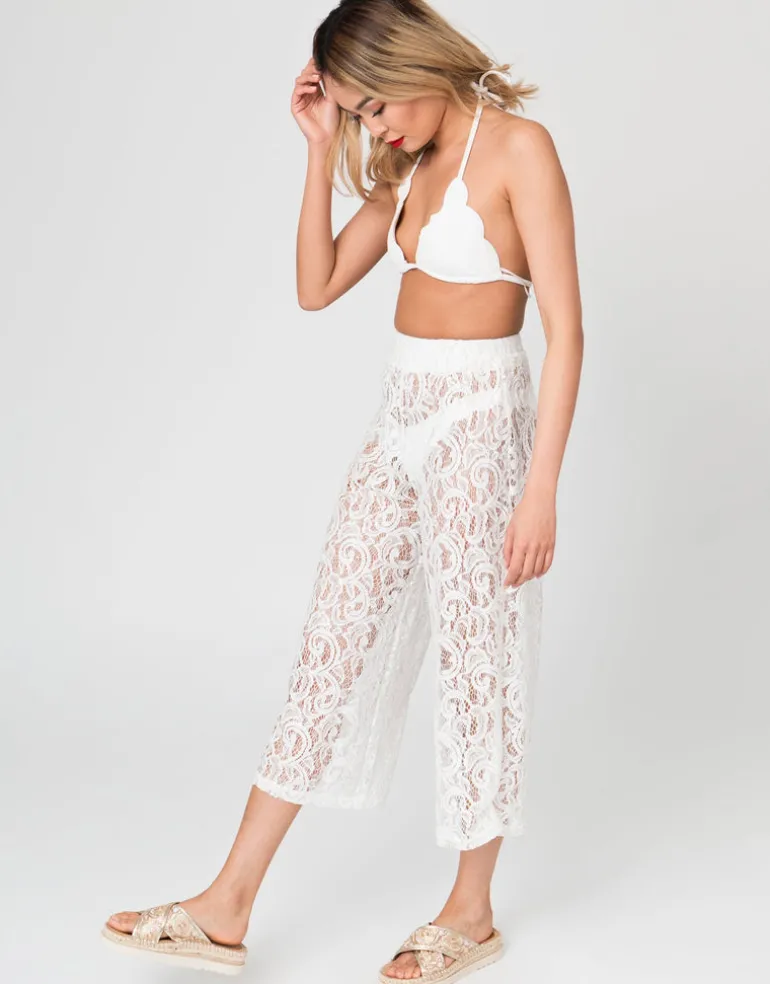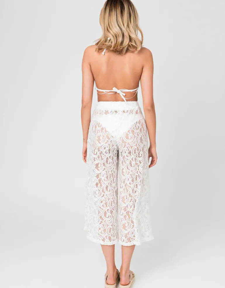 Add a touch of style to your holiday wardrobe in Pia Rossini’s White Zen Culottes. With lace see-through detailing and an elastic waist, these culottes are the height of style and comfort.